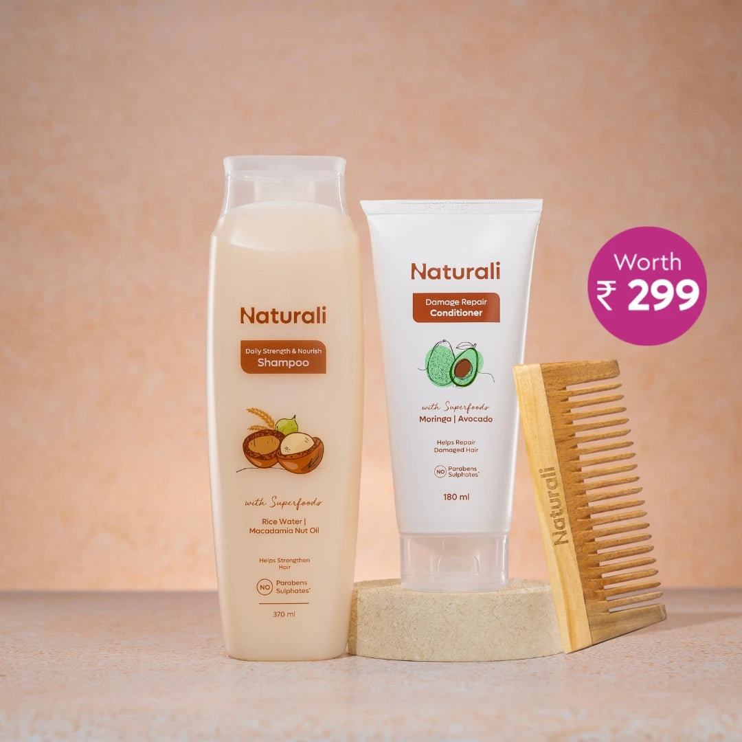 Naturali Daily Strength & Nourish Shampoo + Hairfall Arrest Conditioner + Organic Wooden Neem Comb