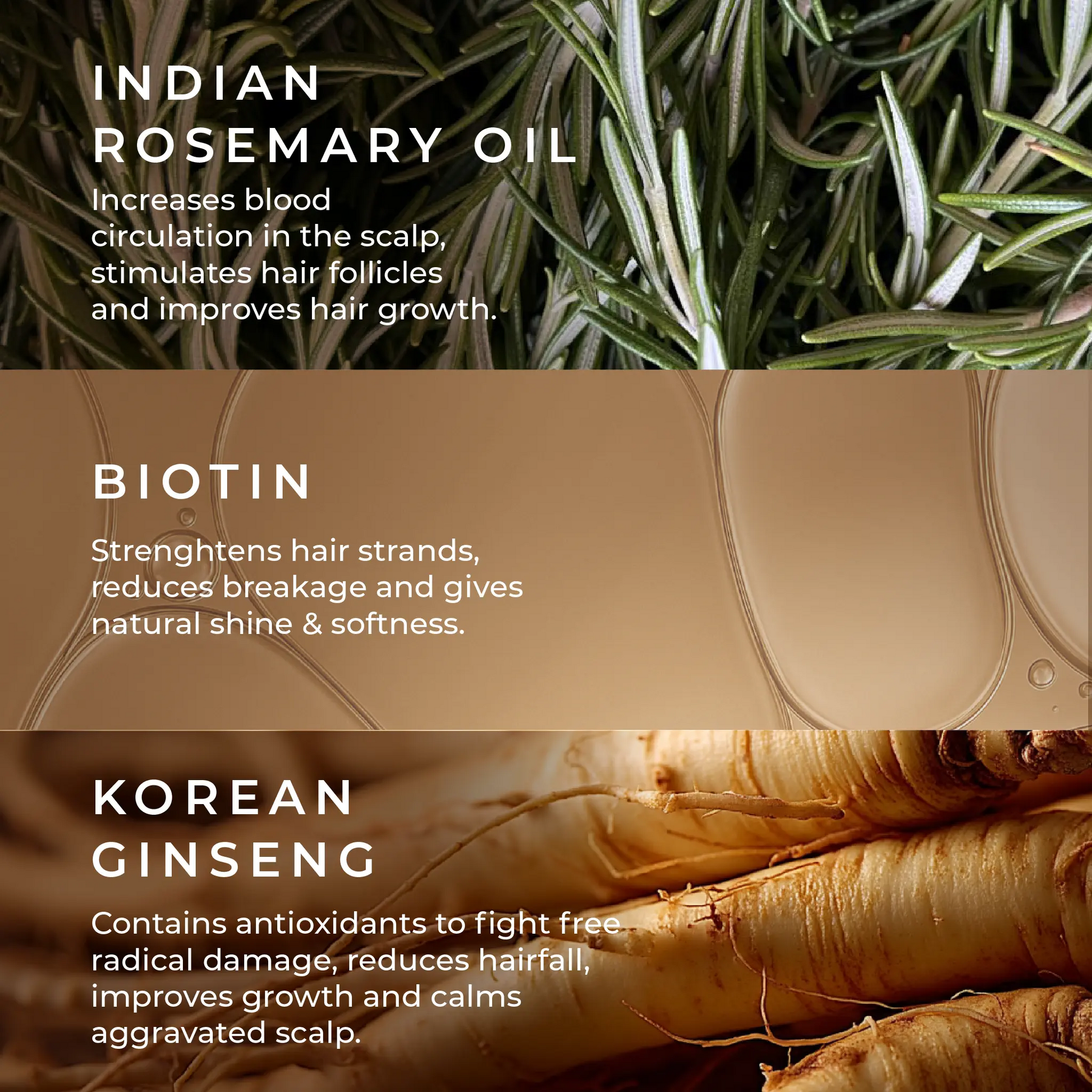 Made with superfoods Rosemary and Korean Ginseng, and powered by Biotin, this conditioner helps reduce hairfall by 4X and strengthens hair. Rosemary from India stimulates growth, while Korean Ginseng boosts scalp health. Biotin promotes fuller, shinier hair. With a creamy, nourishing texture, this sulphate- and paraben-free conditioner gently detangles, nourishes, and supports healthier hair—all while being cruelty-free