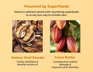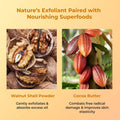 Walnut shell powder buffs away dead skin cells, cocoa butter delivers rich hydration and shea butter nourishes for soft smooth skin.
