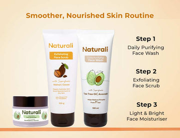 Scrub your way to a clear, healthy complexion with Naturali Exfoliating Face Scrub infused with the goodness of Walnut Shell Powder, Cocoa Butter, and Shea Butter. This blend of natural exfoliant and nourishing superfoods helps to gently exfoliate the skin of dead skin cells and impurities, and absorbs excess oil. Every use of this face scrub helps reveal a brighter, more even skin tone without damaging the skin's barrier.