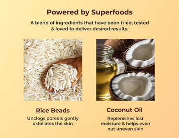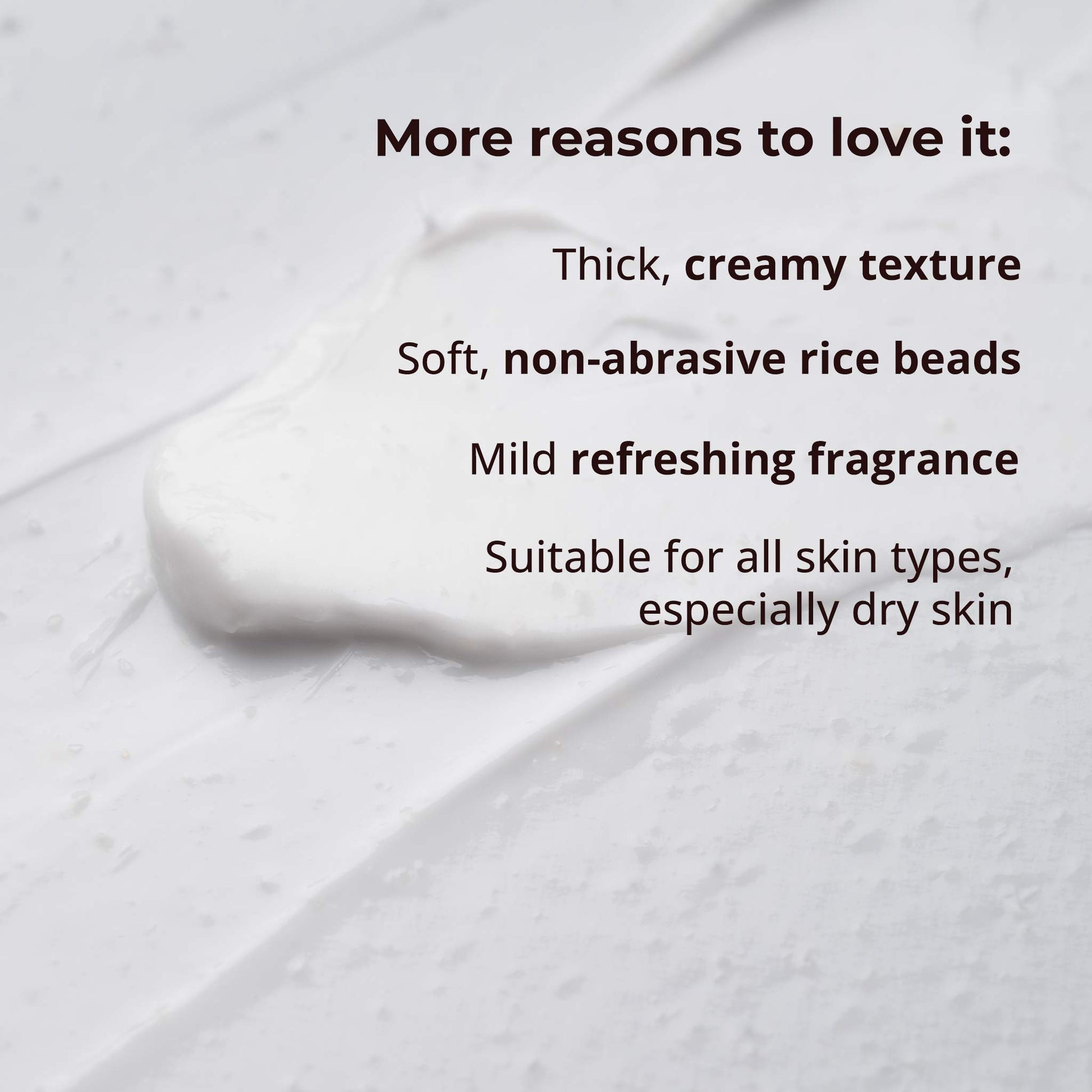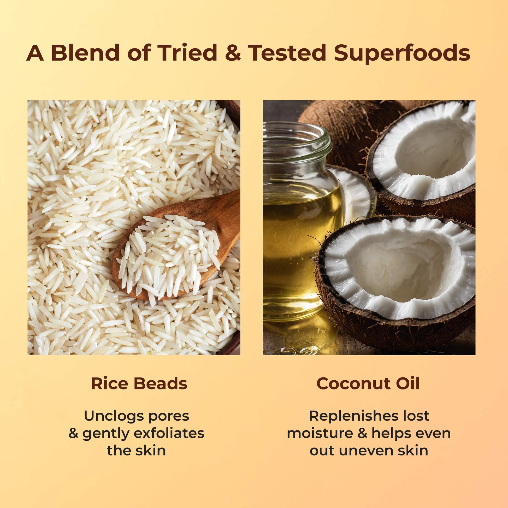 Rice beads for gentle exfoliation and coconut extract for deep nourishment.