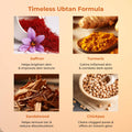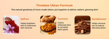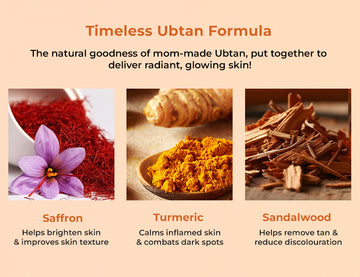 Saffron for brightening Turmeric for glow Sandalwood for soothing and walnut shell powder for gentle exfoliation.